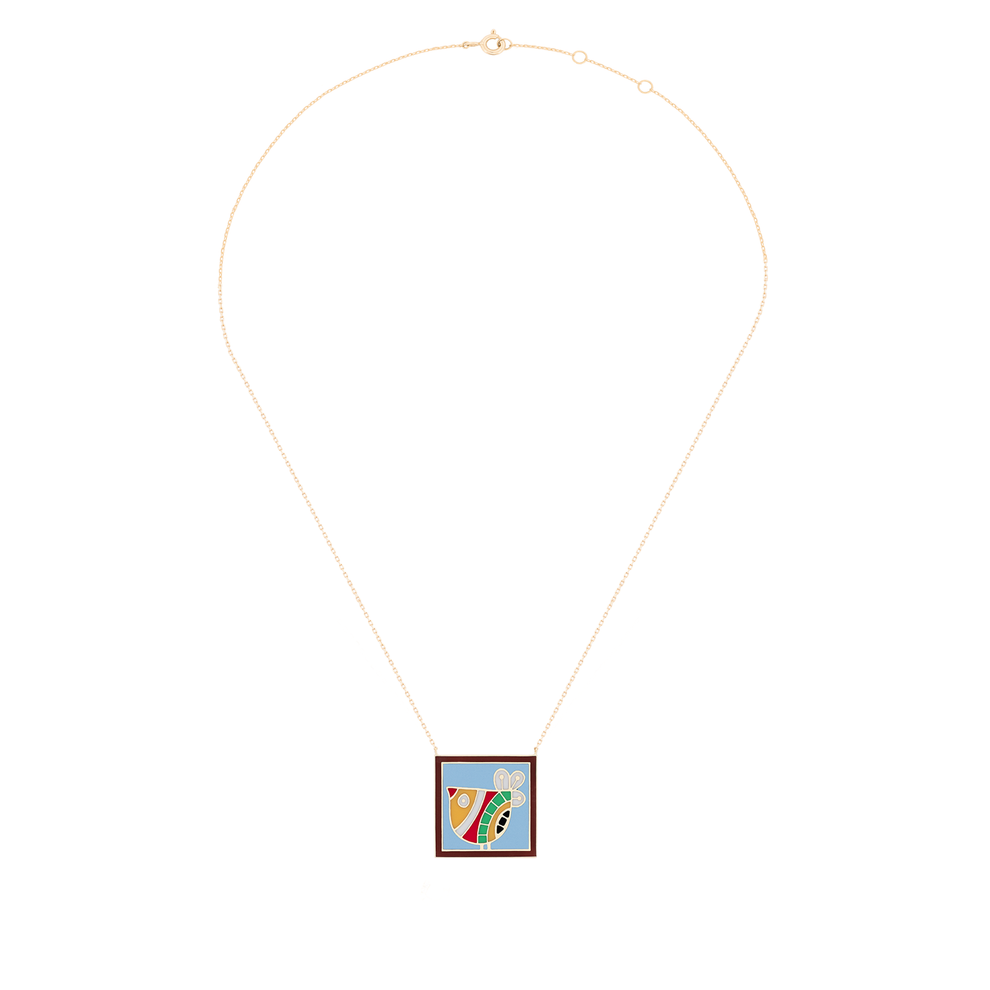 Channel the charm of artistic folklore with this enchanting 18K yellow gold necklace. The square pendant frames a whimsical, stylized bird—reminiscent of a dove or folk-art hen—set against a serene, sky-blue background. The design features intricate, mosaic-like detailing on the wing and tail, combining warm mustard yellow with pops of cherry red, emerald green, and white. Enclosed in a signature dark maroon frame, this piece feels like a storybook illustration brought to life through fine craftsmanship.